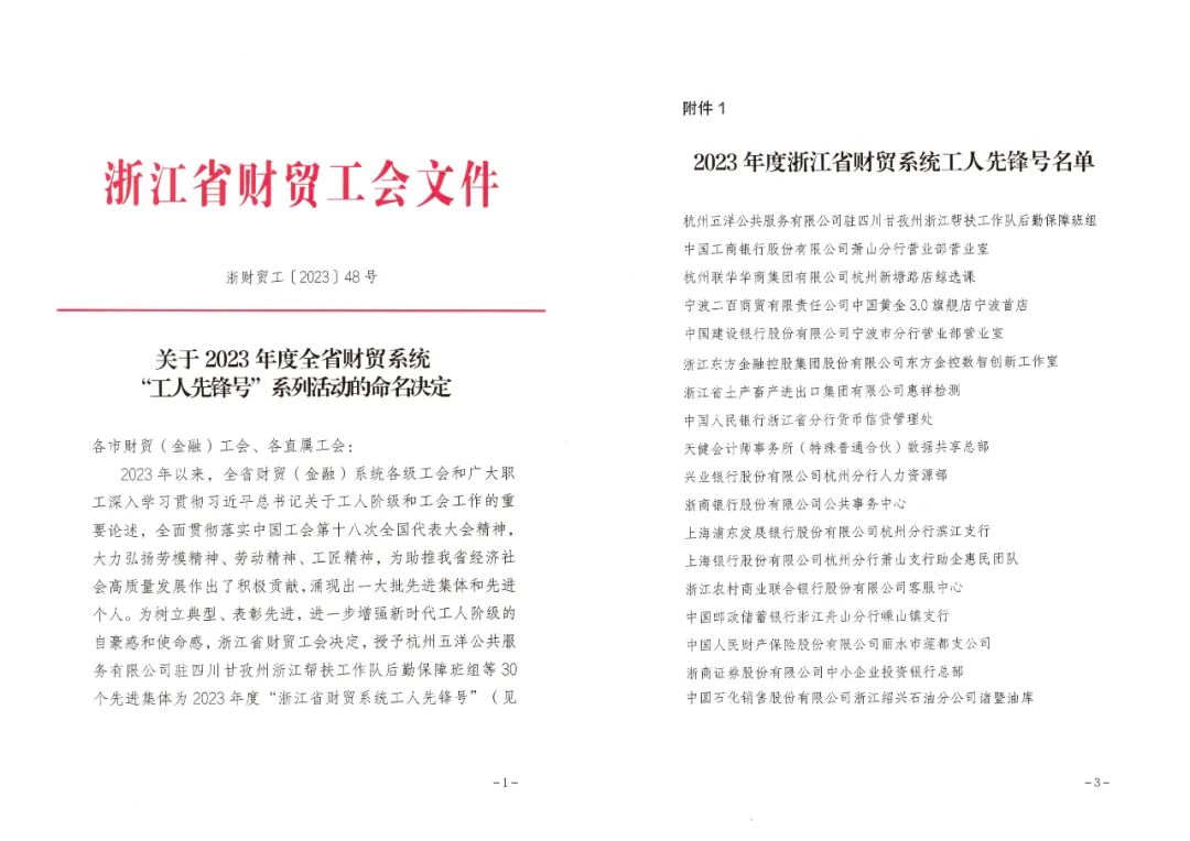 浙江東方獲評(píng)2023年度浙江省財(cái)貿(mào)系統(tǒng)“工人先鋒號(hào)”榮譽(yù)稱號(hào)